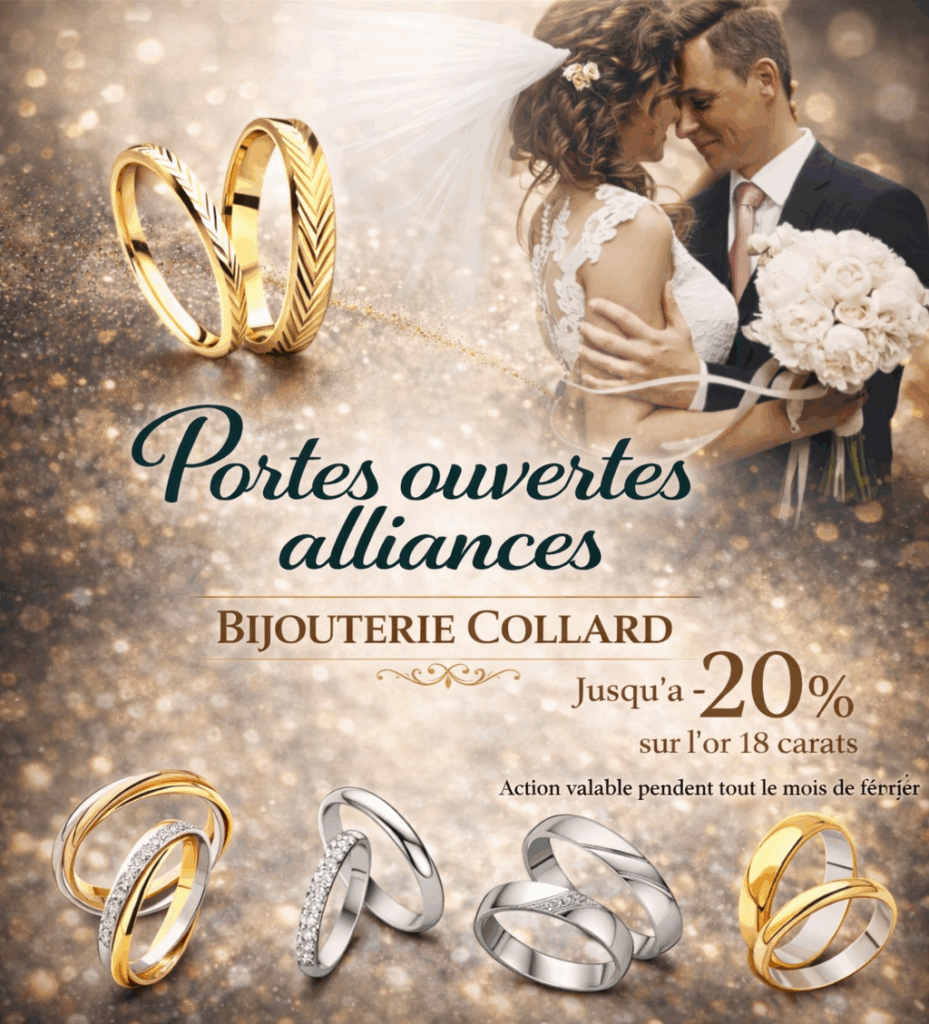 | Réservez votre créneau : https://bit.ly/Rendez-vousalliances Chaque année en février, découvrez l’élégance et le raffinement de nos collections. Préparez le plus beau jour de votre vie avec : -Une sélection raffinée, accessible à tous les budgets – Des offres jusqu’à -20 % sur certaines pièces (conditions en boutique) – Un accueil personnalisé, avec réservation en ligne – Des créneaux nocturnes sur demande, réservés aux personnes ayant un emploi du temps chargé Réservation possible via Google ou Facebook. Bijouterie Collard Faubourg St Germain 69 – 5660 Couvin Téléphone : 060/31 10 96 Vivez une expérience unique et trouvez l’alliance qui vous ressemble. – Sur-mesure, réalisable avec votre or ou nos matériaux – DUO – https://www.duo-trouwringen.com/fr/ – AURODESIGN – https://www.vdbvr.com/en/collections/111/aurodesign – Viventy – Argyor – https://global.argyor.com/en/wedding-rings – AMICI – https://www.vdbvr.com/fr/collections/115/amici – Titan Factory – https://www.titanfactory.com/ |